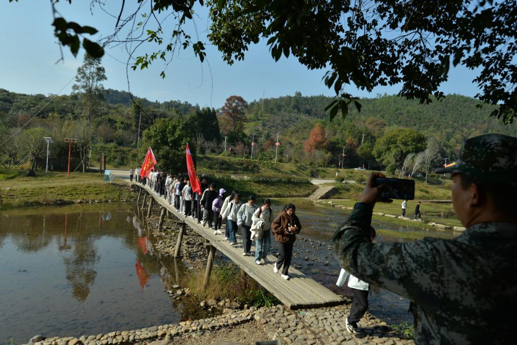 随后,同学们转至祁禄山镇红军长征小道。他们踏上了“重走长征路”的体验征程。沿着于都河畔,走过浮桥旧址,追忆当年八万六千余名红军将士夜渡于都、开启伟大远征的壮烈情景。赖华边走边讲,将长征途中红军将士克服极端自然地理环境的顽强意志,与地质工作者跋山涉水、探矿报国所需的坚韧品质相联系,鼓励同学们要将“长征精神”融入未来的专业学习与职业生涯中。