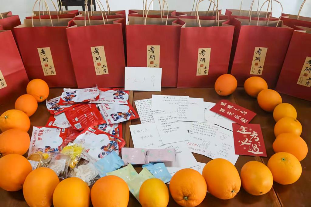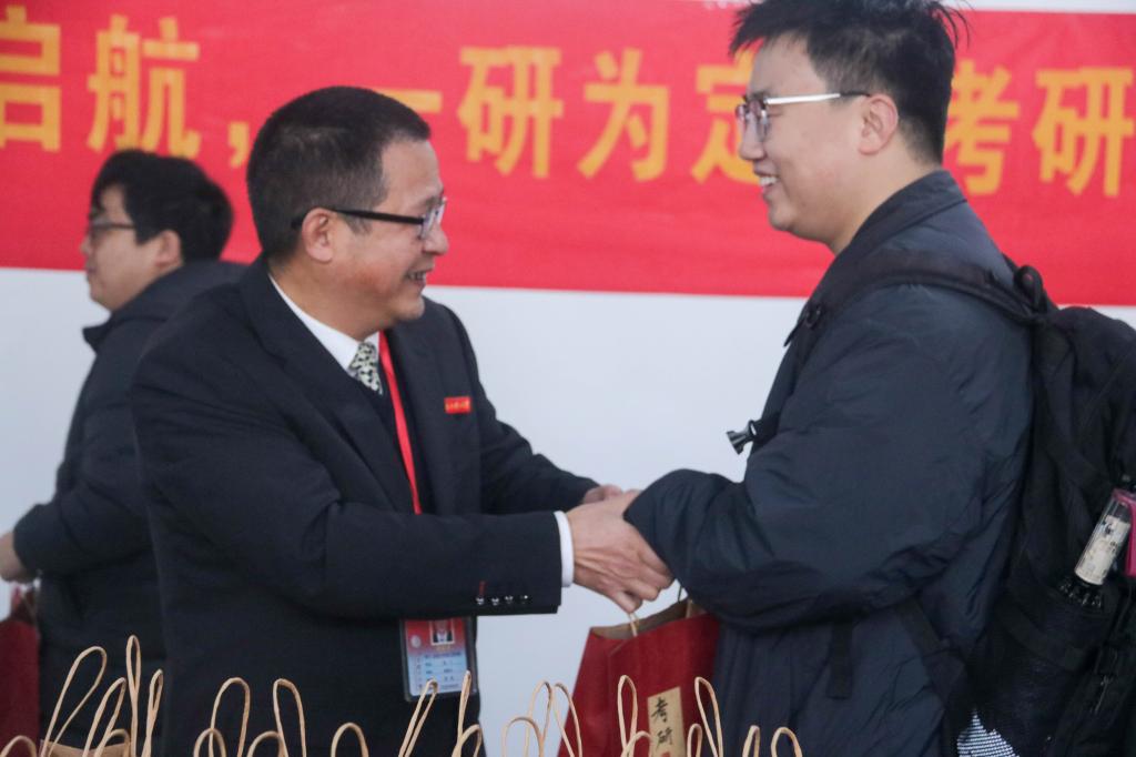 随后,领导、老师们亲手将装有文具、暖心小物的祝福袋递到学子手中,握手、拍肩的互动里,藏着对学子们“一战成硕”的期盼。